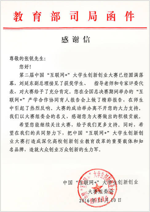 7月7日,2020-2023年国家级大学生创新创业训练计划专家组是为深化高校创新创业教育改革,提高大学生创新创业能力,根据《国家级大学生创新创业训练计划管理办法》(教高函[2019]13号),经广泛征求意见组建的,公示指出,各高校和有关单位将积极支持专家组工作,专家组成员所在单位为专家参加大学生创新创业指导工作提供必要的支持。张锐董事长受聘专家组副组长任期为3年,自2020年起至2023年止。